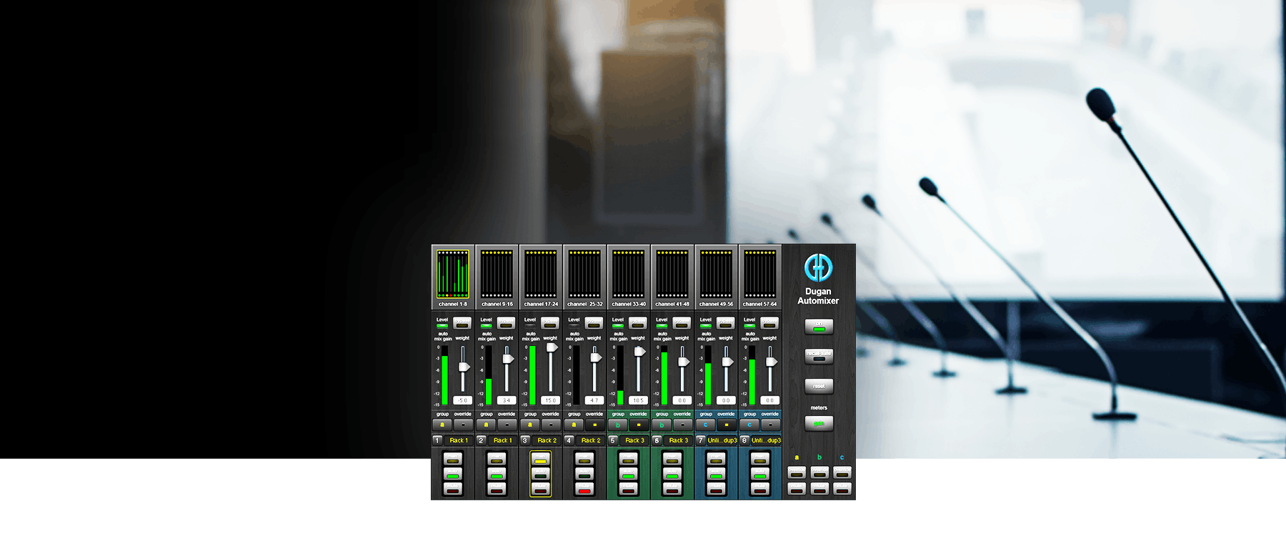 {"channelComponents":[],"topBanner":"\u003Cp\u003EDugan Automixer features 32 or 64 inputs and outputs\u003C/p\u003E","bottomBanner":""}