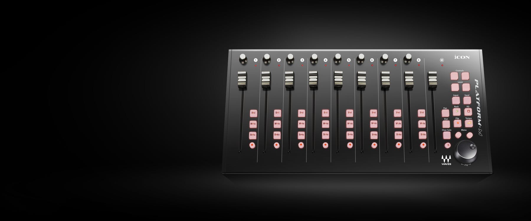 Platform M’s intuitive layout provides 8 full-sized motorized channel faders, 1 master fader, 8 rotary dual-function encoder knobs, lit channel and configuration buttons, touch-and-turn jog wheel for fast parameter control, and access to your entire mix by banking across mixer layers.