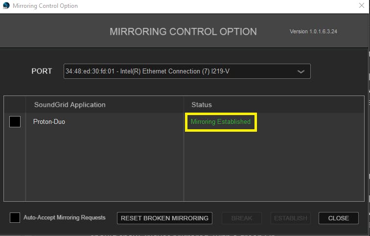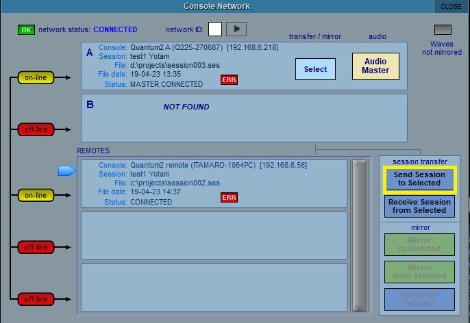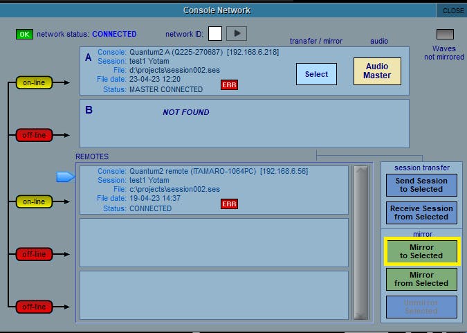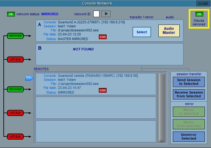 When done, both Mirror Control modules in SuperRack A & B should read: "Mirroring Established" and the console's network window should show 'Waves Mirrored' with a green OK.