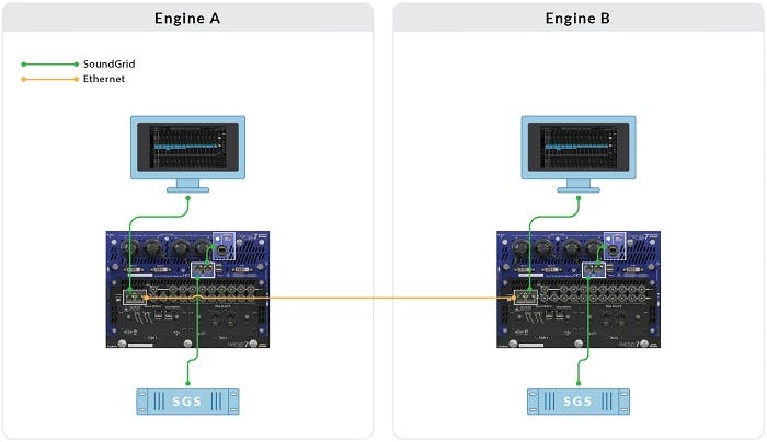Each engine now has its own complete, synchronized SuperRack system as set up above. They are separate systems, but communicate via the SoundGrid network.